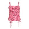 - Features: Front ruching detail with drawstring ties; shoulder straps; printed yummy jersey fabric