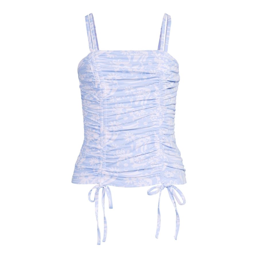 - Features: Front ruching detail with drawstring ties; shoulder straps; printed yummy jersey fabric